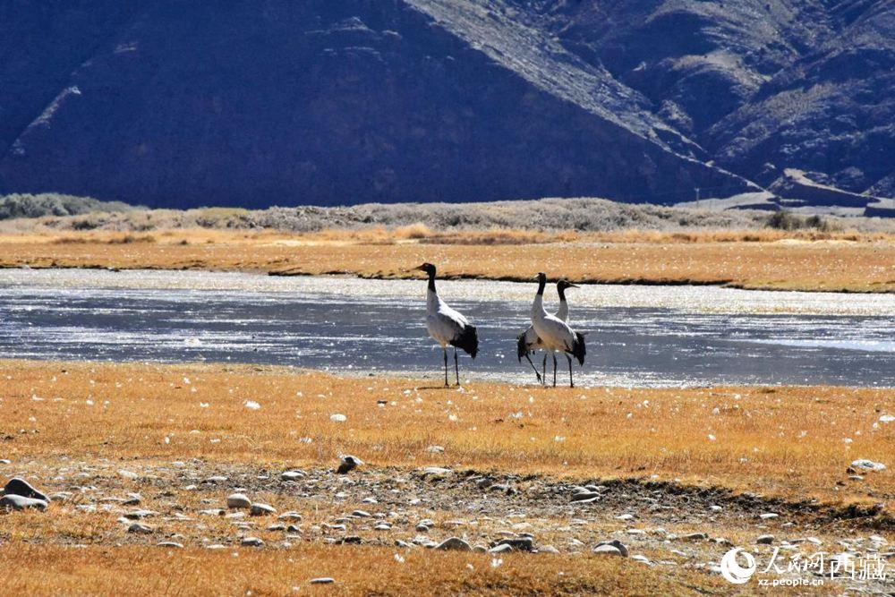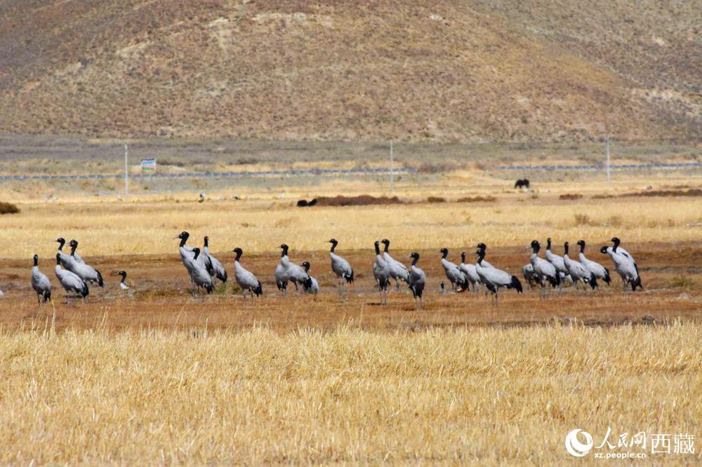黑頸鶴在收割完的青稞地。人民網(wǎng) 李海霞 攝