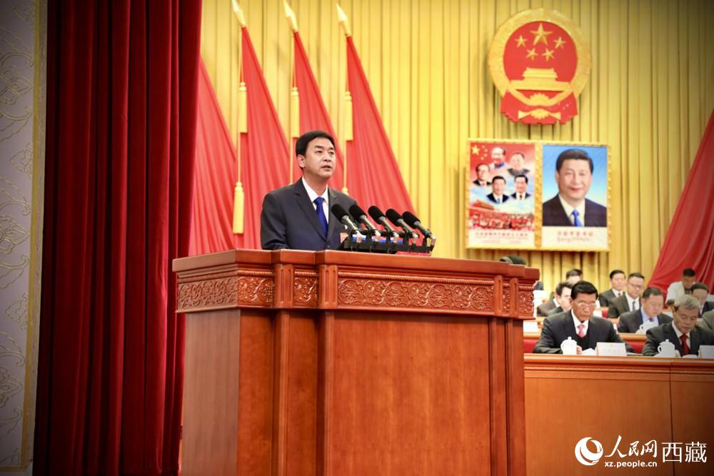 西藏自治區(qū)人民政府代理主席嚴(yán)金海向大會作政府工作報告。人民網(wǎng) 次仁羅布攝