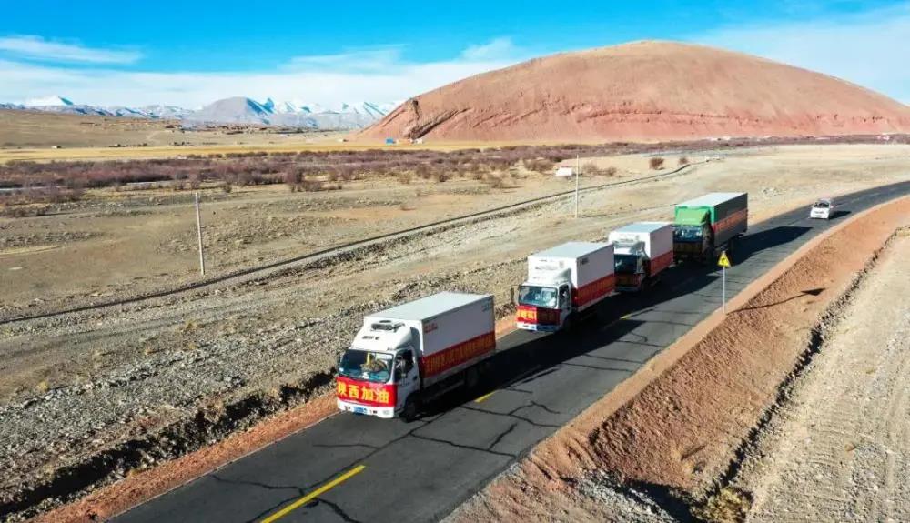 4輛滿(mǎn)載援助物資的卡車(chē)從西藏阿里地區(qū)駛向陜西省。(受訪者供圖)