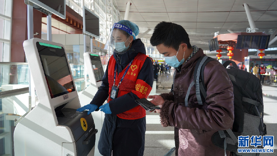 1月17日,志愿者協(xié)助旅客辦理電子乘機(jī)手續(xù)。新華網(wǎng) 達(dá)珍 攝