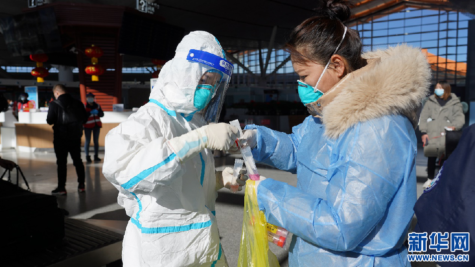 1月17日,防疫人員在拉薩貢嘎機(jī)場大廳進(jìn)行環(huán)境采樣。新華網(wǎng) 達(dá)珍 攝