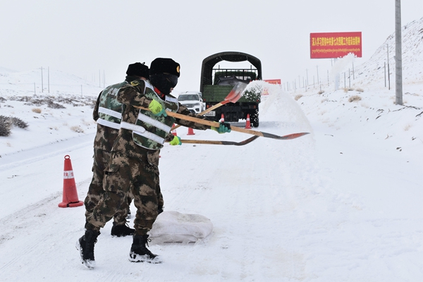 圖為武警官兵正在對結(jié)冰路段拋灑融雪劑。貢鎳攝