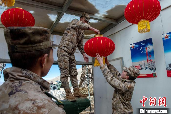 圖為官兵裝點布置營區(qū),營造春節(jié)氛圍?!⊥跏鰱| 攝