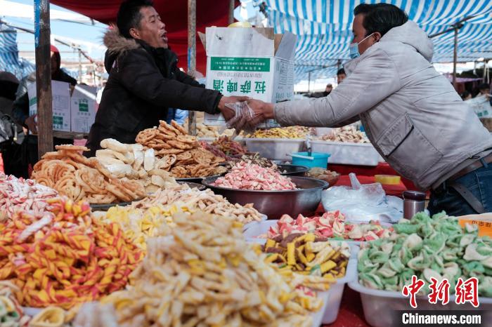 以農(nóng)耕為主的日喀則有“西藏糧倉”之稱,為不耽誤農(nóng)事,包括日喀則在內(nèi)的農(nóng)耕區(qū)習(xí)慣提前一個月,在藏歷十二月慶祝新年,被稱為日喀則農(nóng)事新年。1月31日是春節(jié)除夕,恰逢日喀則農(nóng)事新年的“古突夜”,小新在日喀則年貨市場看到,該市場內(nèi)的“卡塞”、青稞苗、“羅薩美朵”、牦牛肉干、酥油、糖果等各類藏式年貨琳瑯滿目,大家也抓緊時間置辦,為晚上熱熱鬧鬧過“古突”做最后的準備。