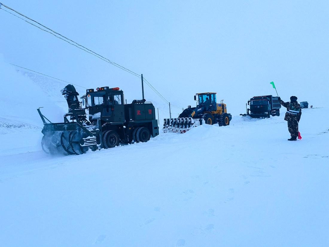 圖為武警官兵正在新藏線馬莜木拉段清理積雪。