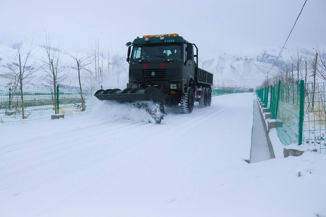 圖為武警官兵利用除雪車清理路面積雪結(jié)冰。