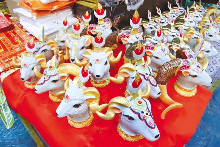 “隆果”也只在藏歷新年前出售,是藏歷新年必備的年貨之一,從新年的初一到十五期間擺放在家里,其余時間,即便是在常年熱鬧的沖賽康市場也很難尋見,所以當(dāng)看到塑彩羊頭時,也就代表年關(guān)將至。