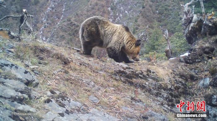 資料圖為2021年10月29日在西藏自治區(qū)丁青縣境內由紅外相機拍攝到的棕熊活動影像。 中新社發(fā) 山水自然保護中心 供圖