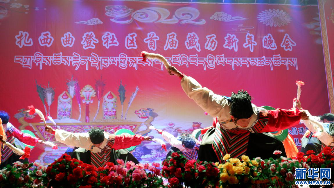 扎西曲登社區(qū)首屆藏歷新年晚會上的傳統(tǒng)舞蹈節(jié)目《雅礱卓舞》(2月26日攝)。新華網 殷小燕攝