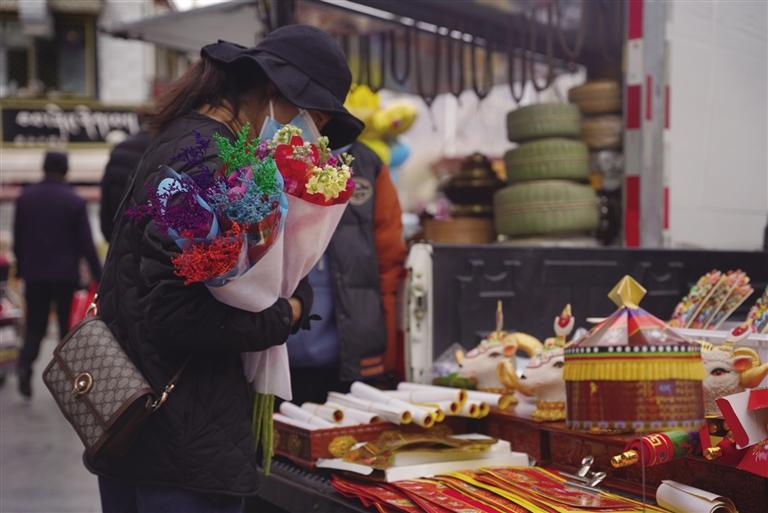千門萬戶曈曈日,總把新桃換舊符。隨著各民族交往交流交融,藏文對聯(lián)也逐漸成為藏歷新年年貨市場中不可缺少的“成員”,寄托了人們對來年美好生活的殷切期盼。走進(jìn)沖賽康市場,記者看到很多攤位都擺放著各式各樣紅色藏式對聯(lián),內(nèi)容主要蘊(yùn)含平安、健康、長壽等吉祥的寓意,不時(shí)還有市民前來詢價(jià)選購。此外,每年藏歷新年前,不少書法家還會(huì)將滿載祝福的對聯(lián)寫好后送給市民,把濃濃的年味和對藏歷新年的祝福送到大家手中。