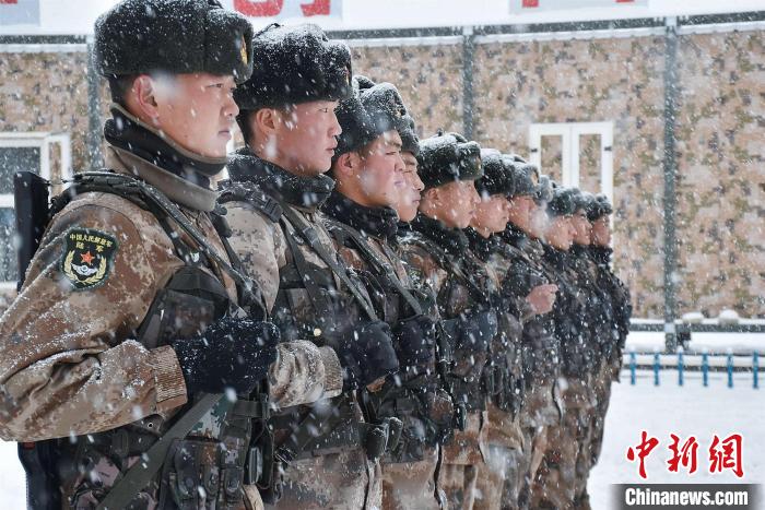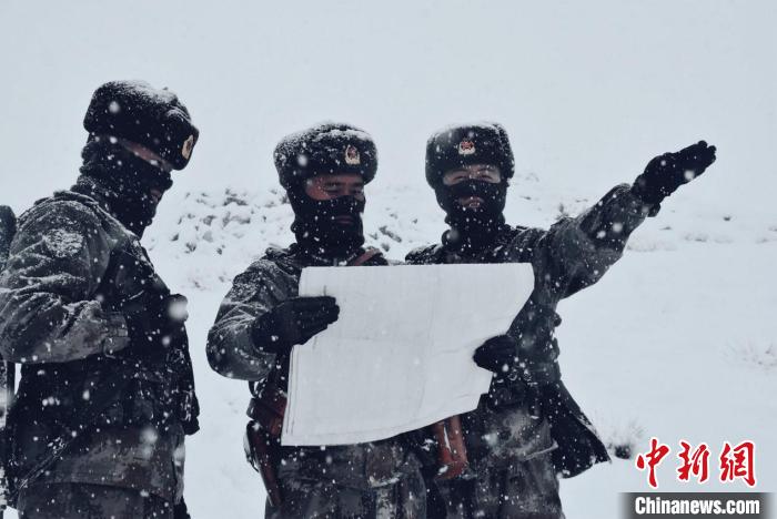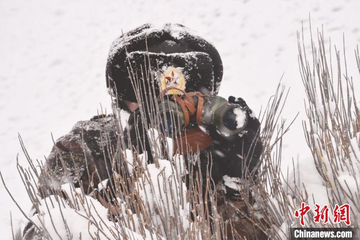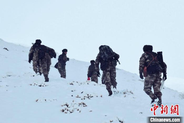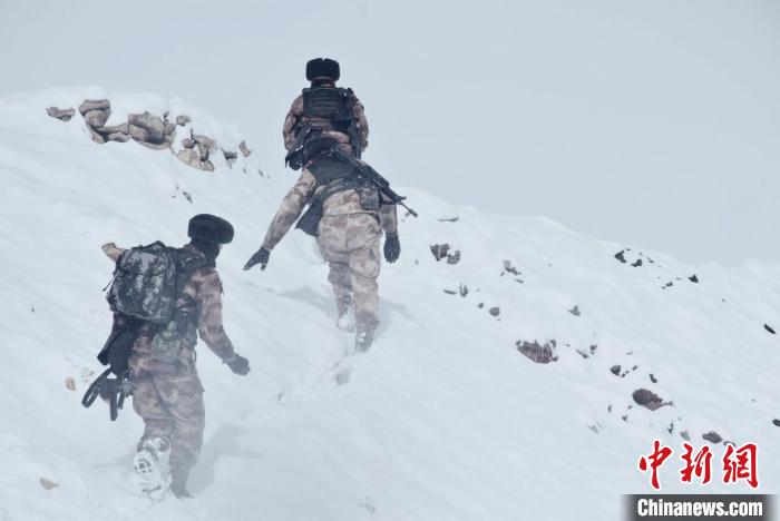 由于道路積雪較厚,車輛無法通行。官兵們采取徒步方式向點(diǎn)位前行,巡邏分隊(duì)在風(fēng)雪中艱難前行,隨著海拔的逐漸增加,氧氣愈發(fā)稀薄,此時的氣溫已經(jīng)接近零下30攝氏度。