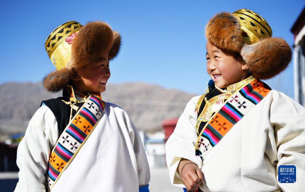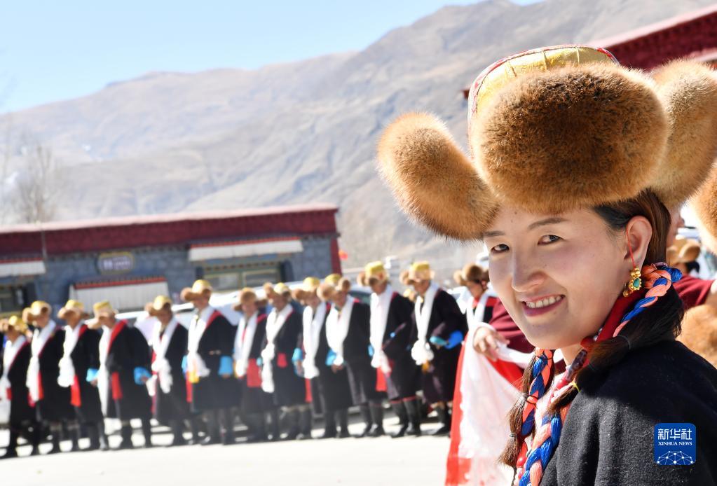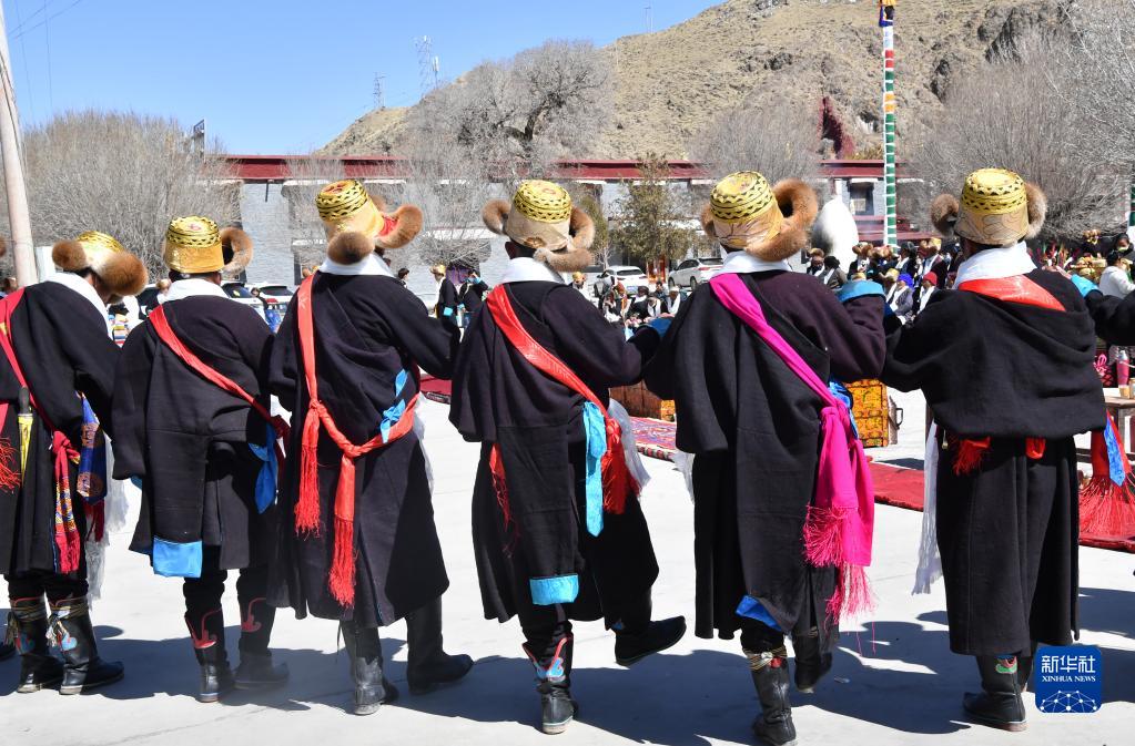 3月3日,西藏山南市貢嘎縣崗堆鎮(zhèn)農(nóng)民穿著嶄新的氆氌藏裝參加藏歷新年活動。新華社記者 覺果 攝