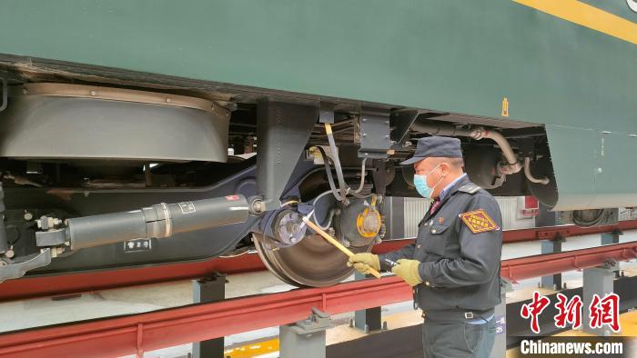 資料圖為嘎瑪達(dá)吉利用庫停時(shí)間對列車走形部進(jìn)行檢查。青藏集團(tuán)公司供圖