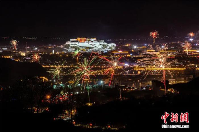 2021年2月10日晚,藏歷新年辭舊迎新“古突”夜,拉薩夜空煙花璀璨。當日是藏歷12月29日,自此,藏族民眾一年中最隆重的節(jié)日——藏歷新年的一系列活動正式拉開序幕。中新社記者 何蓬磊 攝