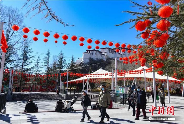 2022年1月29日,拉薩宗角祿康公園內(nèi),大紅燈籠高高掛起。隨著新春佳節(jié)和藏歷新年的臨近,古城拉薩大街小巷張燈結彩,洋溢著喜慶的節(jié)日氛圍。中新社記者 貢嘎來松 攝