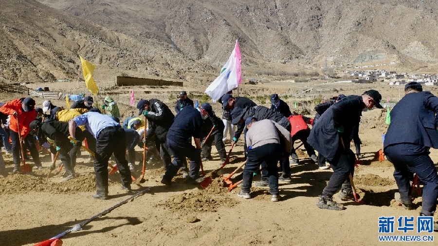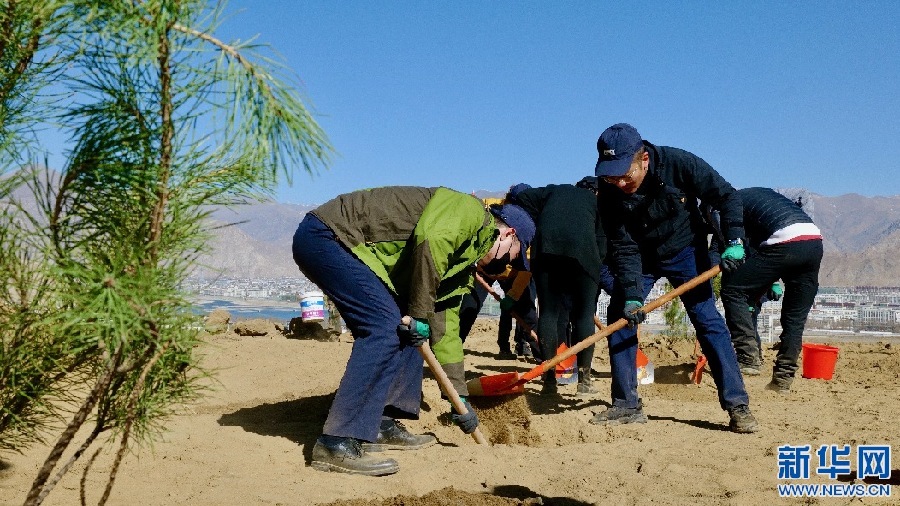 3月15日,西藏銀行員工正在進行植樹比賽。新華網(wǎng) 柑丹鴦琦 攝