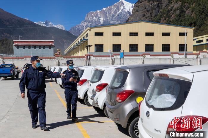 圖為拉薩海關(guān)關(guān)員在吉隆口岸出口貨物查驗(yàn)場監(jiān)管出口國產(chǎn)電動車。資料圖 拉薩海關(guān)供圖