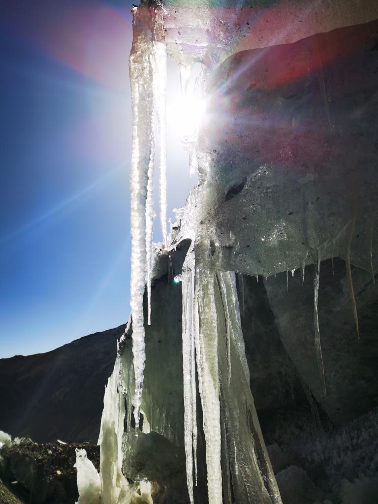 2022年3月27日拍攝的冰川融化形成的冰柱。(手機(jī)照片,新華社記者 沈虹冰 攝)
