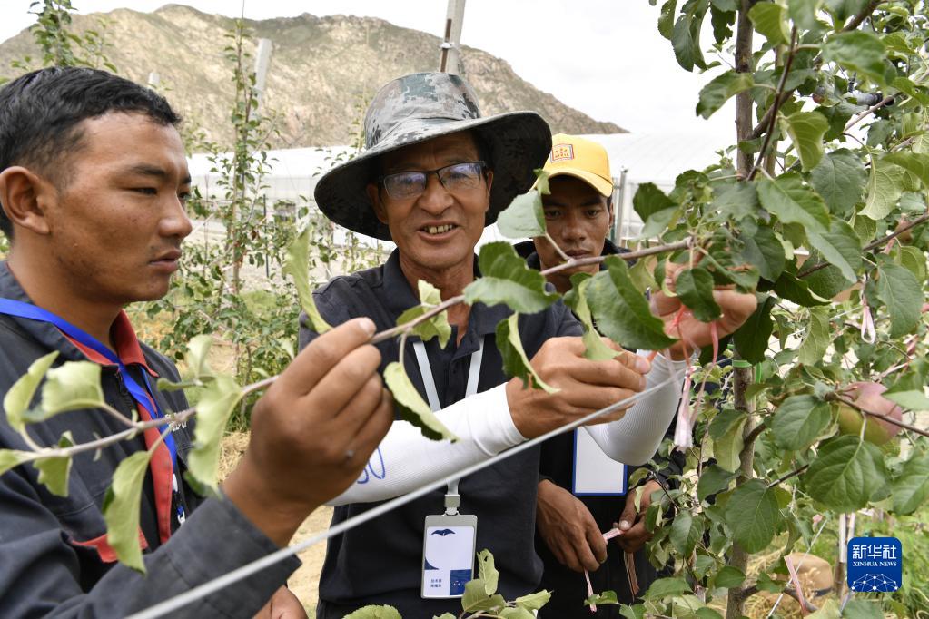 技術(shù)人員(中)在指導(dǎo)森布日村村民管理蘋果樹(shù)(資料圖)。新華社記者張汝鋒攝