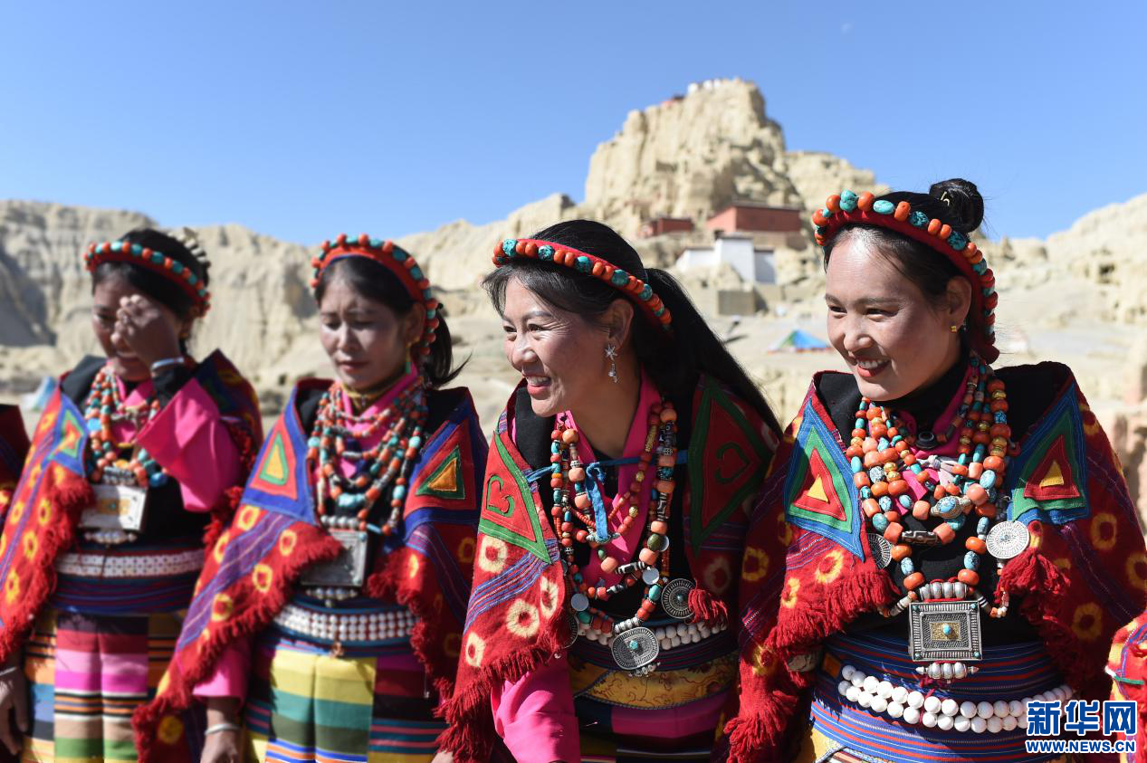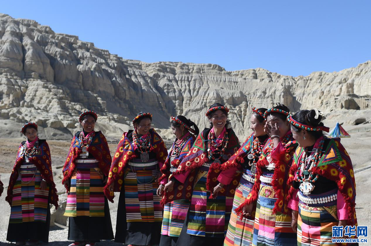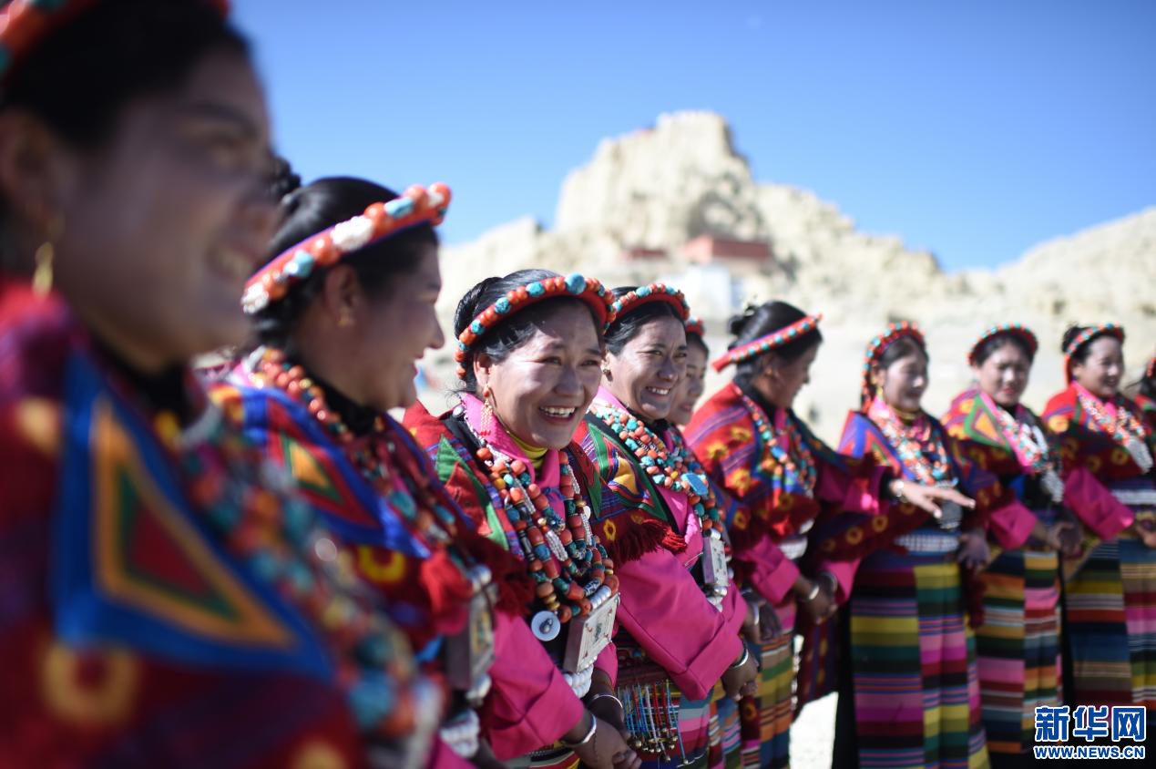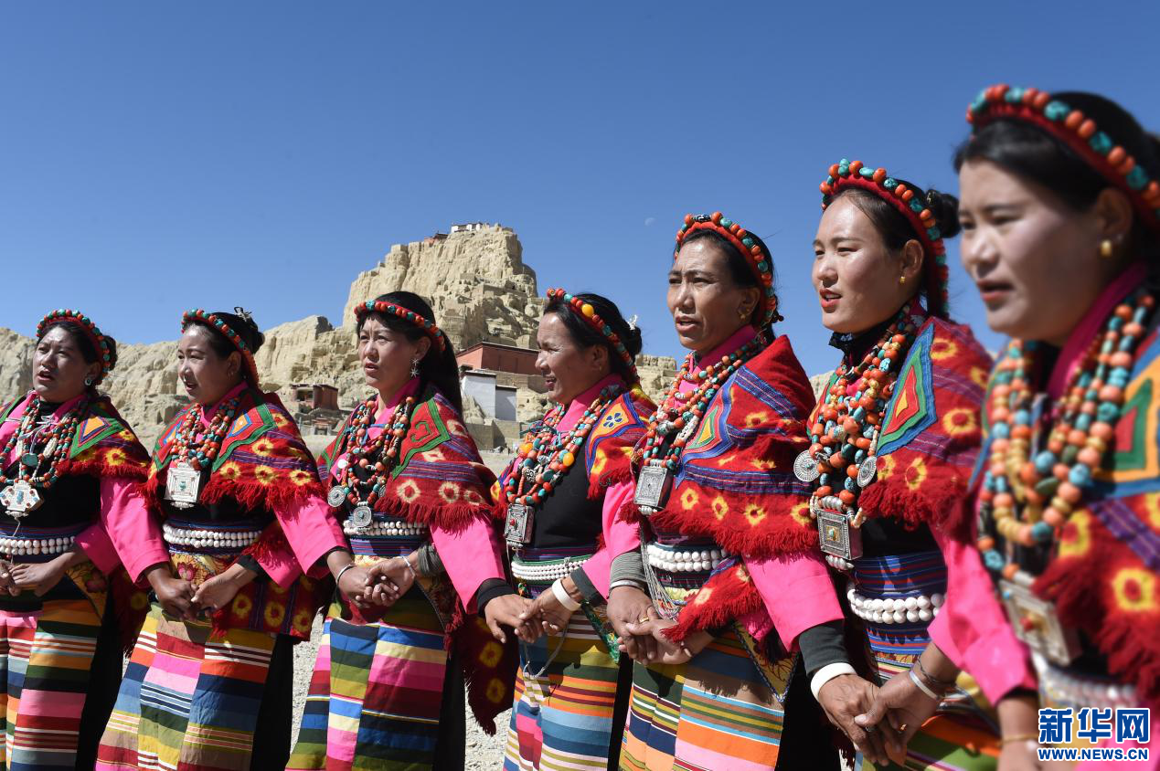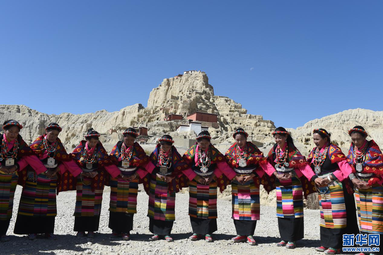 圖為當?shù)厝罕娫诠鸥裢醭z址腳下準備表演宣舞(4月23日攝)。新華網 旦增努布攝