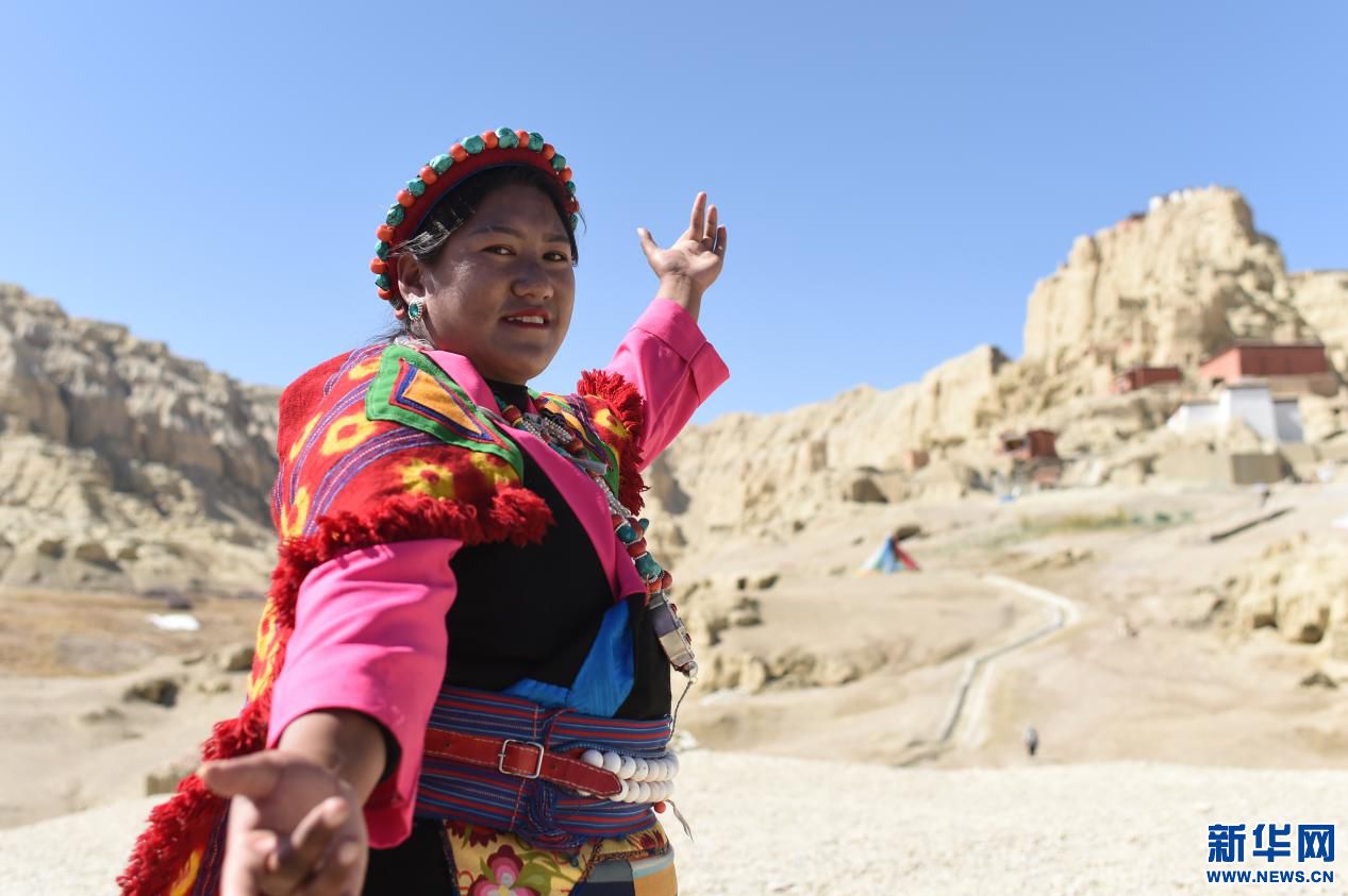 4月23日,一名當?shù)厝罕娫诠鸥裢醭z址腳下表演宣舞。新華網 旦增努布攝