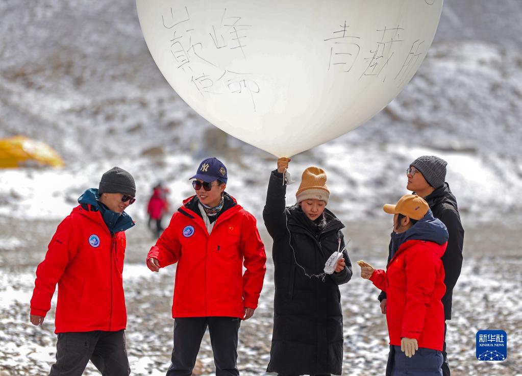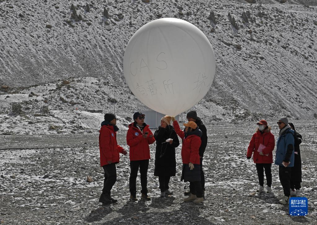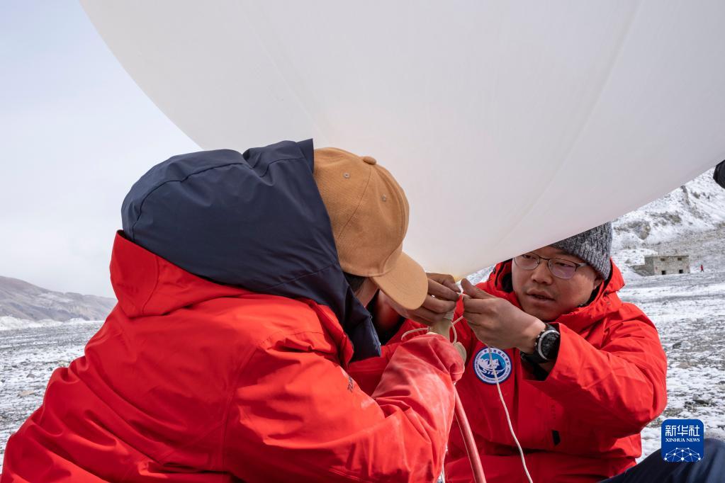 在珠峰登山大本營(yíng),科研人員放飛無(wú)線電探空氣球(4月30日攝)。新華社記者 姜帆 攝