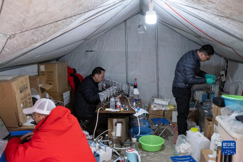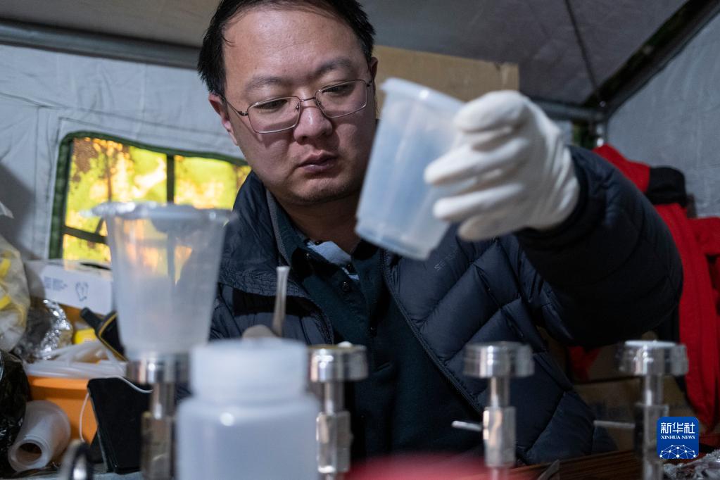 在珠峰登山大本營(yíng),科研人員提取冰川融水里的微生物(4月30日攝)。新華社記者 孫非 攝