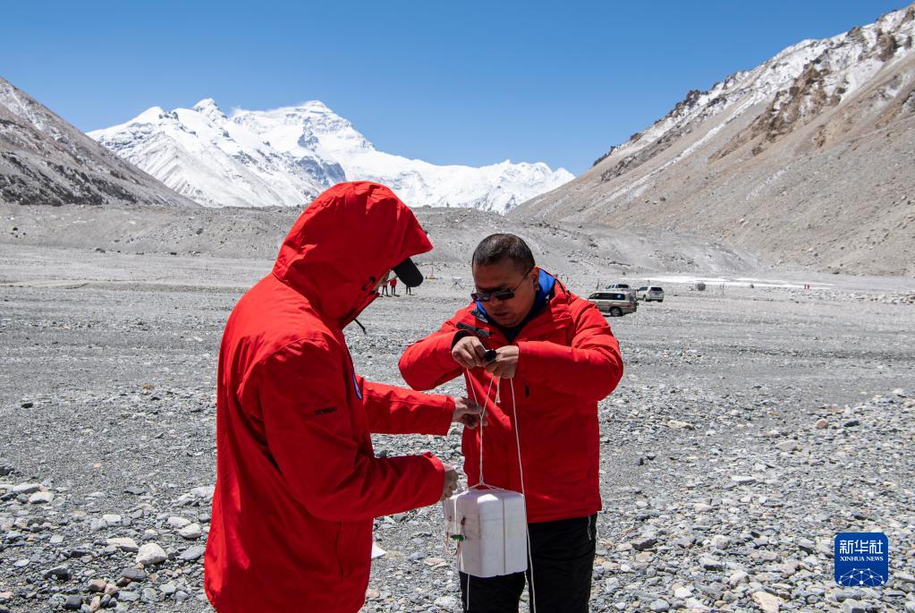 在珠峰登山大本營,科研人員檢查臭氧通量裝置運行情況(5月3日攝)。新華社記者 姜帆 攝