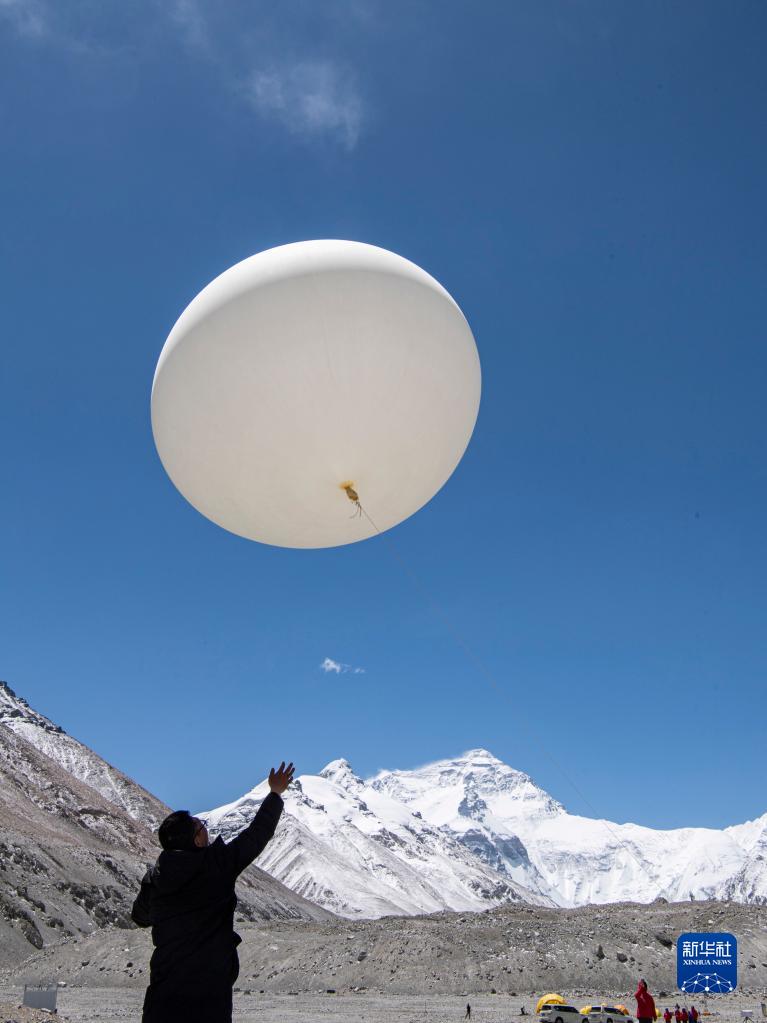 這是在珠峰登山大本營,科研人員施放的大氣臭氧探空氣球(5月3日攝)。新華社記者 孫非 攝