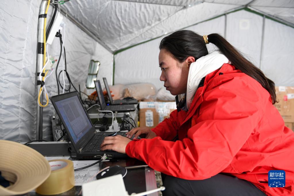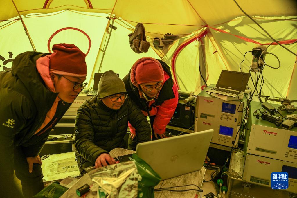 在珠峰登山大本營,科研人員查看大氣數(shù)據(jù)(5月3日攝)。新華社記者 姜帆 攝