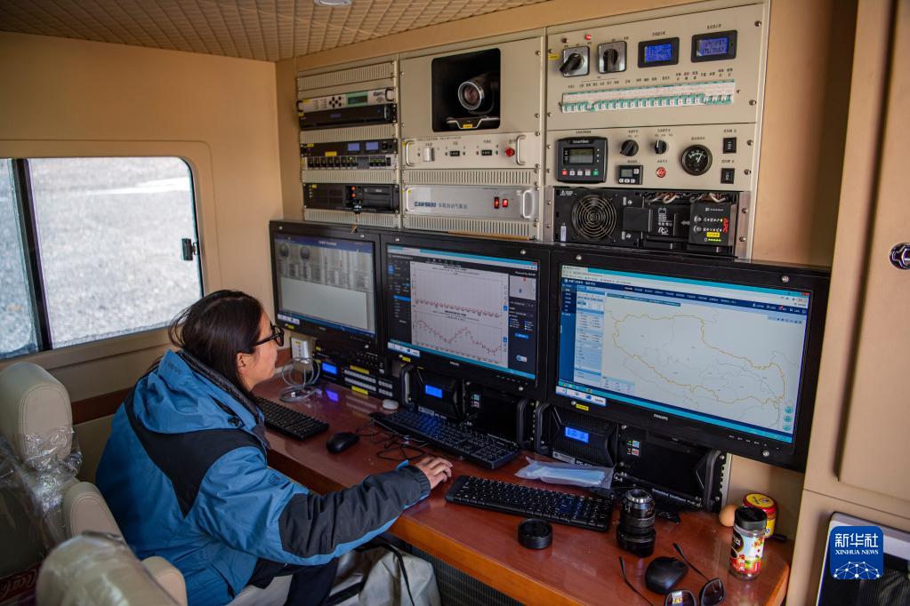 在珠峰登山大本營的氣象應急保障車內(nèi),西藏自治區(qū)氣象局工作人員在查看實時氣象數(shù)據(jù)(5月3日攝)。新華社記者 孫非 攝
