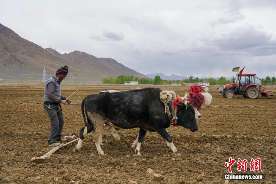 5月2日,西藏日喀則田間,“二牛抬杠”和拖拉機(jī)耕地同時進(jìn)行。 江飛波 攝