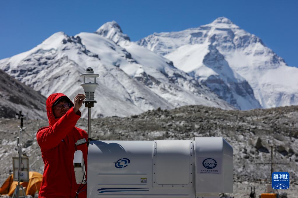 5月3日,在珠峰登山大本營,科研人員檢查微波輻射計(jì)。新華社記者 姜帆 攝