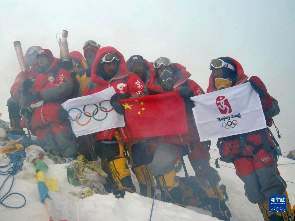 2008年5月8日,北京奧運圣火珠峰傳遞登山隊成功登頂珠峰,德慶歐珠(右五)與隊友在峰頂展示中國國旗、奧運五環(huán)旗和北京奧運會會徽旗。