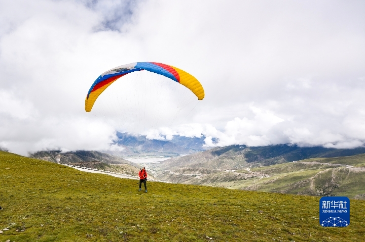 德慶歐珠在西藏練習(xí)滑翔傘運動。