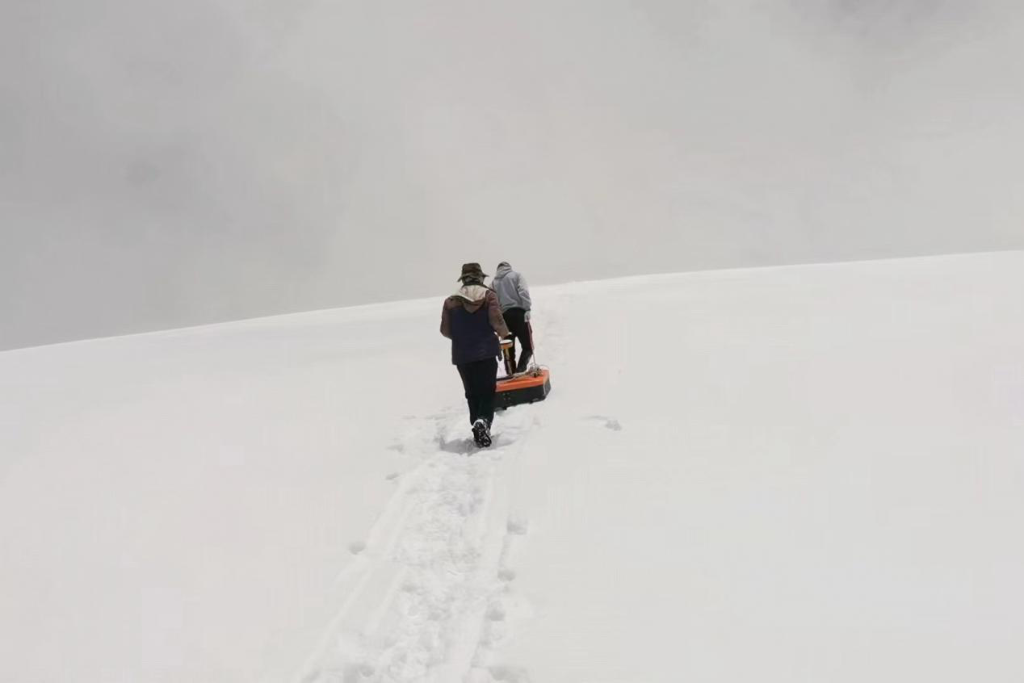 科考隊(duì)員拉著冰川雷達(dá)測(cè)厚儀開展測(cè)量工作。新華社發(fā)
