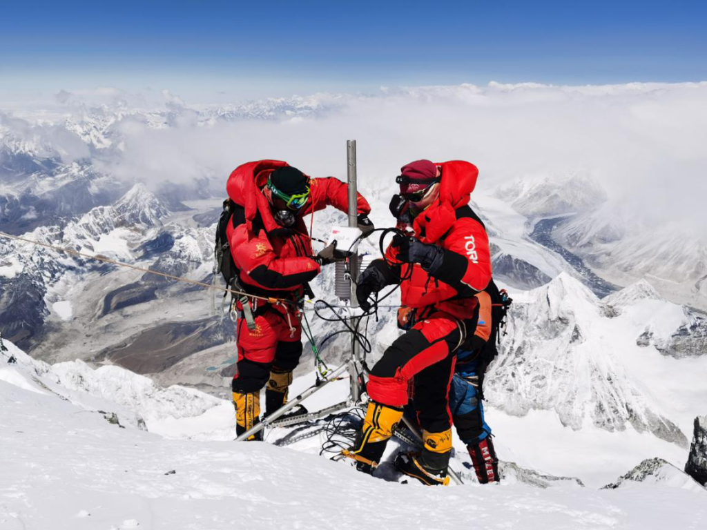 科考隊(duì)員在珠峰架設(shè)自動(dòng)氣象站。新華社特約記者 索朗多吉 攝