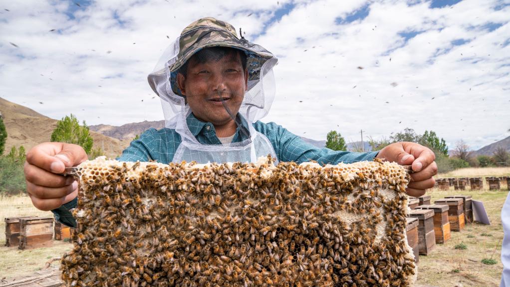 山南市錯(cuò)那縣覺拉鄉(xiāng)村民普巴占堆正在查看蜜蜂情況。新華社記者 孫非 攝