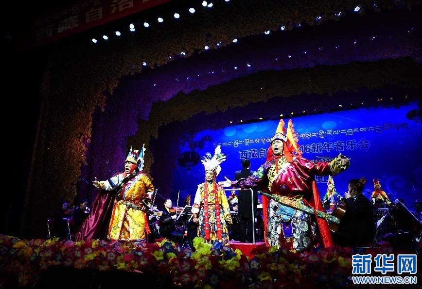 2015年12月30日晚,在拉薩舉行的西藏自治區(qū)2016年《吉祥彩虹》新年音樂會上,演員表演格薩爾說唱。新華社記者 晉美多吉攝