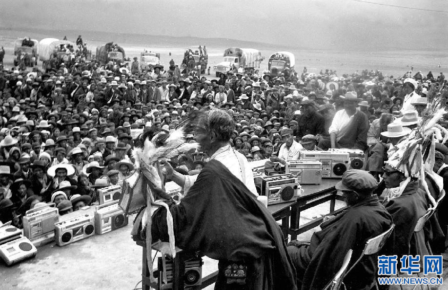 西藏那曲縣78歲的民間藝人阿達向觀眾說唱《格薩爾王傳》。新華社記者 馬競秋 攝(1986年1月15日發(fā))