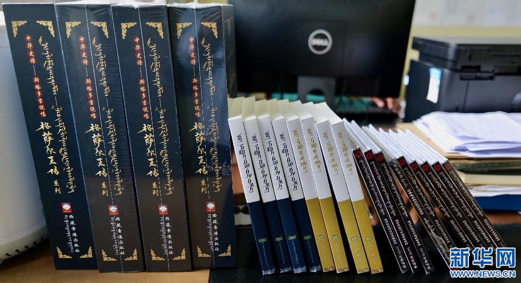 2022年5月30日,圖為已出版的斯塔多吉說唱的《格薩爾王傳》系列。新華網(wǎng) 柑丹鴦琦 攝