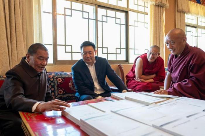 2022年4月15日,西藏自治區(qū)黨委常委、統(tǒng)戰(zhàn)部部長,自治區(qū)政協(xié)黨組副書記、副主席嘎瑪澤登(左二)在西藏佛學(xué)院調(diào)研。 本報(bào)記者 江飛波 攝