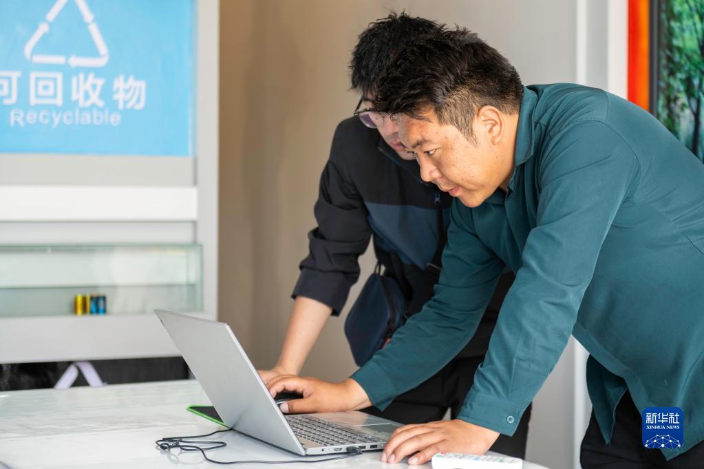“格?;ㄩ_”大學(xué)生就業(yè)創(chuàng)業(yè)特訓(xùn)營學(xué)員、西藏墨竹工卡格桑花開大學(xué)生創(chuàng)業(yè)管理有限公司創(chuàng)辦人頓珠次仁(右)在墨竹工卡縣生活垃圾分類宣教中心講解垃圾分類常識(2022年6月23日攝)。新華社記者 周荻瀟 攝