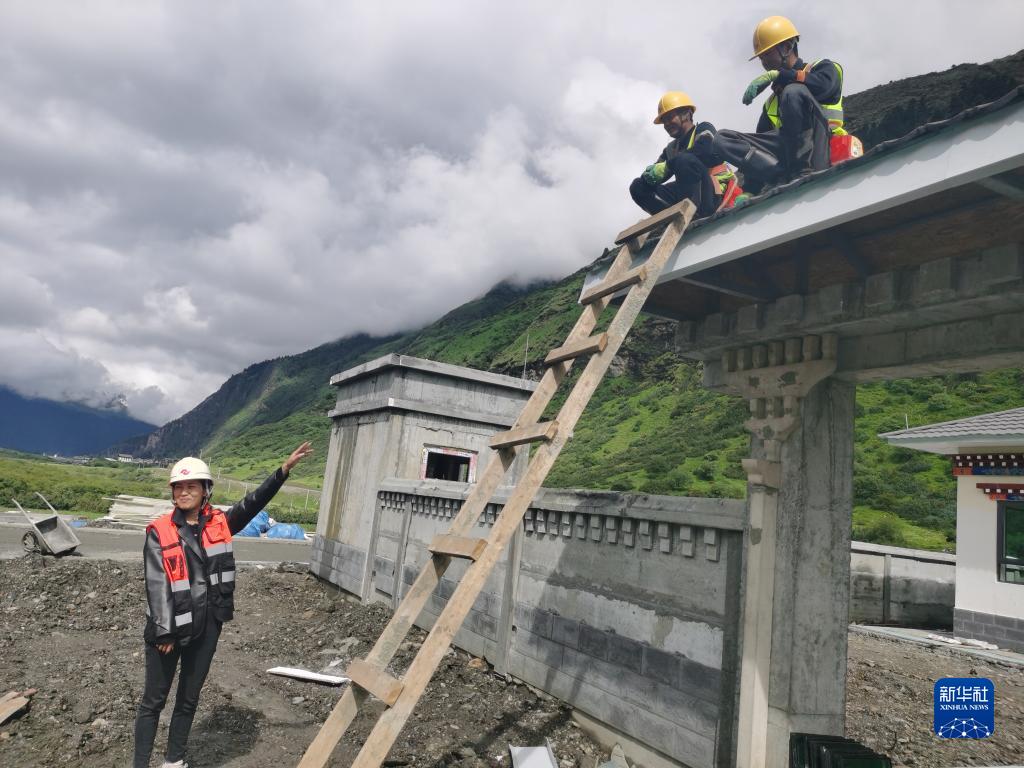 “格?;ㄩ_”大學(xué)生就業(yè)創(chuàng)業(yè)特訓(xùn)營學(xué)員、西藏藏建科技股份有限公司職員阿吉卓瑪(左)在施工現(xiàn)場工作(2022年6月28日攝)。