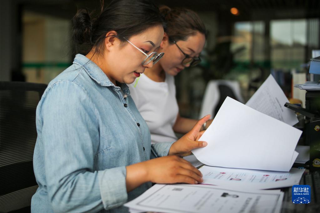 “格?;ㄩ_”大學(xué)生就業(yè)創(chuàng)業(yè)特訓(xùn)營學(xué)員、西藏藏建科技股份有限公司職員次仁瓊達(dá)(左)在工作(2022年6月24日攝)。新華社記者 姜帆 攝