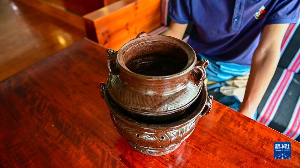 在拉薩市墨竹工卡縣,洛桑益西在自己開的藏餐店內(nèi)展示作為藏式牛肉湯容器的塔巴陶瓷(6月23日攝)。新華社記者 周荻瀟 攝