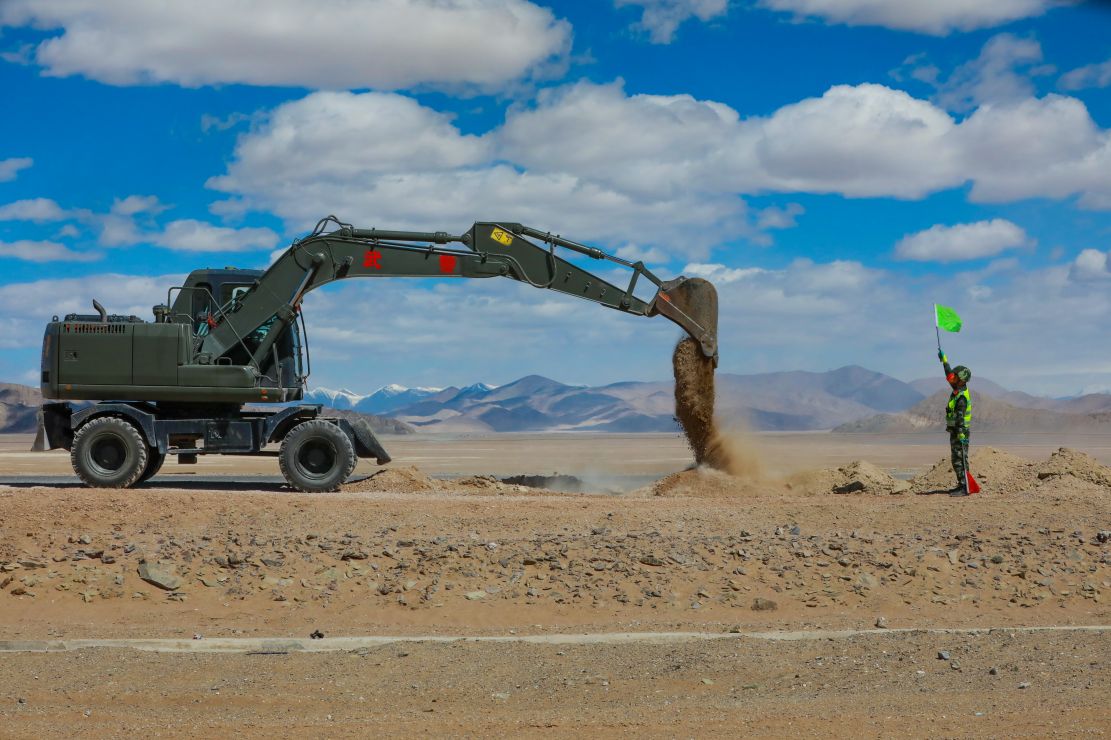 中午時分,紫外線異常強烈,伴隨著狂風(fēng)卷起的沙粒,打在臉頰陣陣作痛。在茫茫無人區(qū),放眼望去只見官兵來回穿梭在天路的忙碌身影,挖掘機回填路基、裝載機運送砂石料、平地機攤鋪路面、壓路機壓實路基、瀝青車燒制拌合瀝青……官兵們井然有序,在各自戰(zhàn)位各司其職,一段段損壞的道路隨后就被修復(fù)一新。
