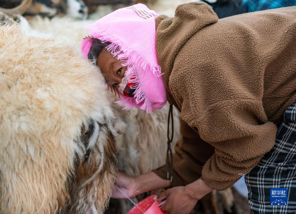傍晚,男人們放牧歸來,羊群被趕到圍欄邊,嘎瑪?shù)耐鈱O女石秀措姆加入了擠奶的隊(duì)伍。