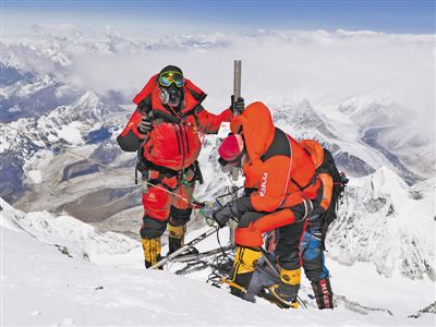 科考隊員在珠峰海拔8800米以上架設(shè)自動氣象站。新華社特約記者 索朗多吉攝