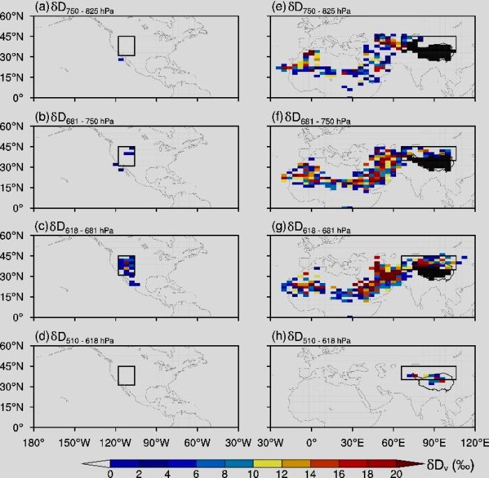 夏季美國西部和亞洲干旱區(qū)不同層水汽穩(wěn)定同位素的“反高程效應”的空間分布格局。 中科院青藏高原所 供圖